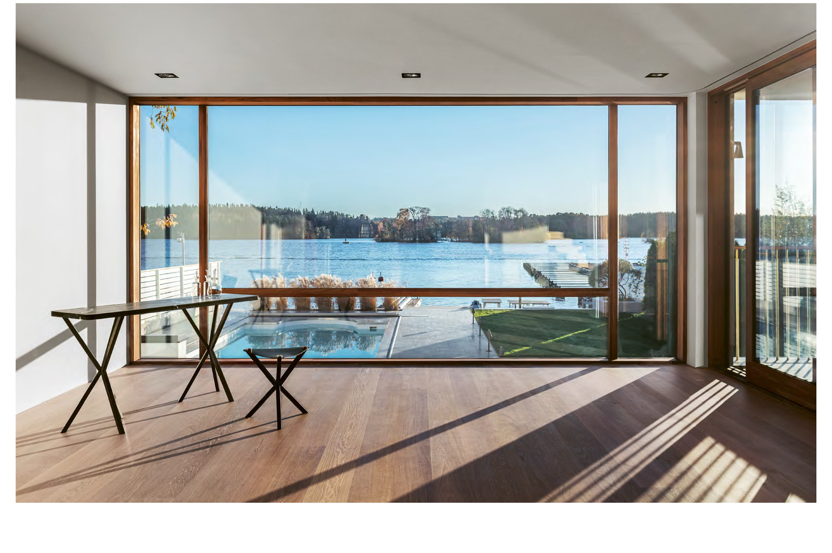 Lyftgliddörrar = När handtaget vrids lyfts dörrbågen upp från tröskeln och kan rulla/glida iväg. Innovativ lösning som ger en lyxig känsla.